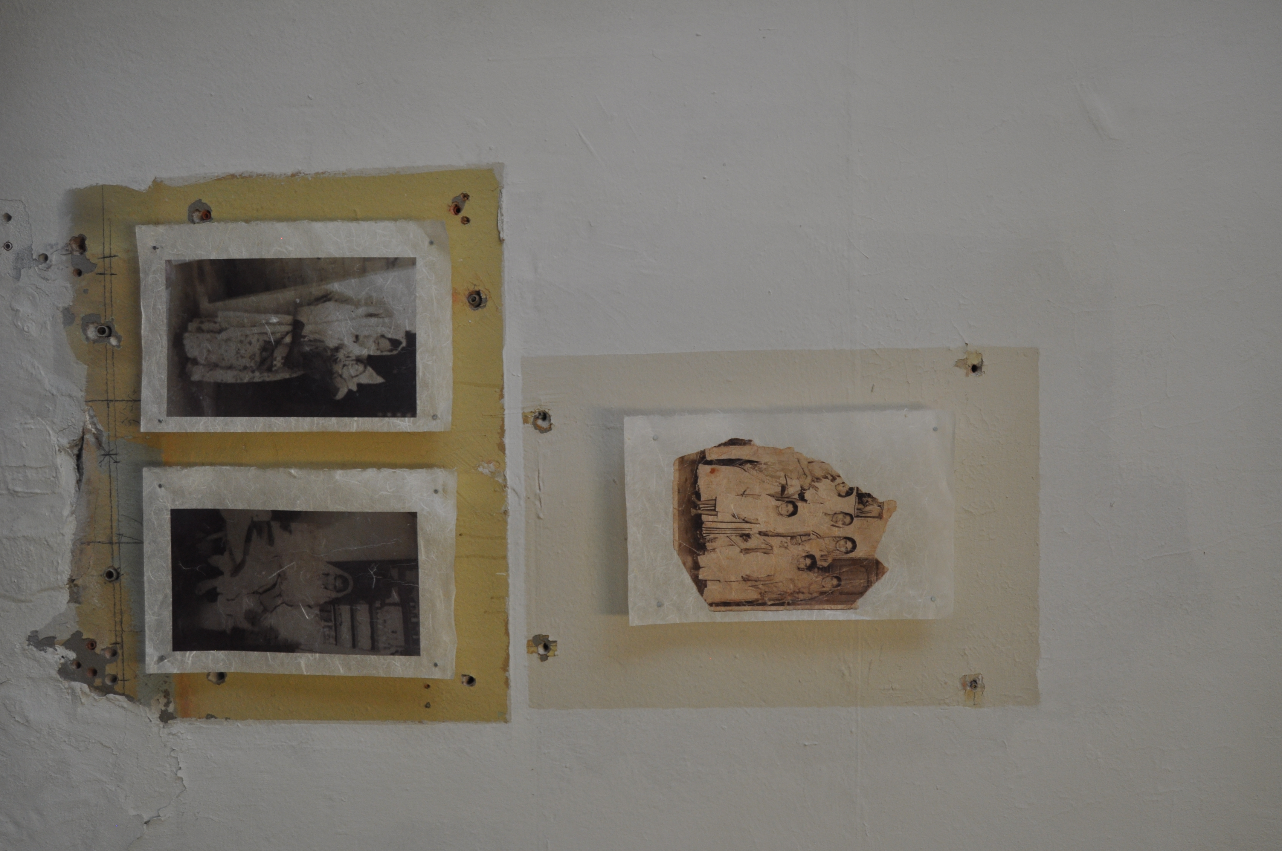 Materials: digital video (looped), three monitors, rice paper prints, stitched textiles scrolls, found suitcase, wooden crates, archival material (1951-2001).